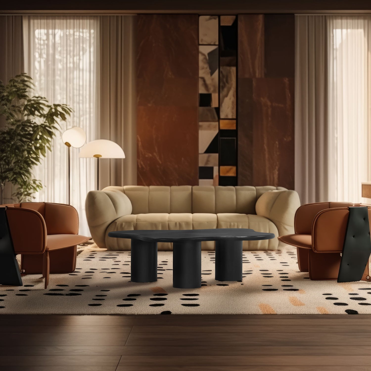 The Romaine Coffee Table is a stunning piece that will elevate the style of any living space. Its modern, sleek matte finish gives it a sophisticated look, while its sturdy iron metal construction ensures durability. The pedestal bases provide excellent support and stability, and the wavy top adds a unique design element. It's a great way to add a distinctive touch to any space.