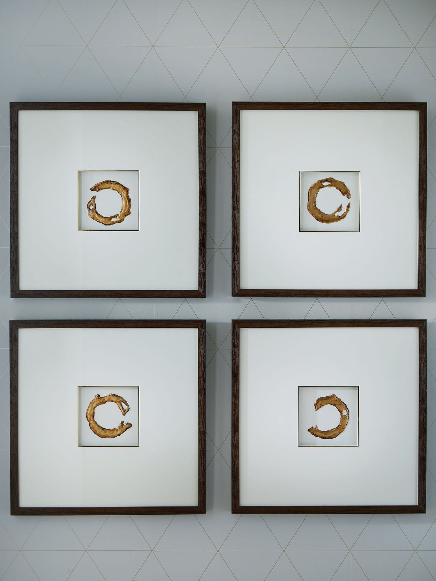 Taking an abstract approach to neutrals, this wall art set seamlessly balances an elevated feel with inviting style. The white and gold images are enhanced with hand painted embellishments, and each piece is beautifully framed in a dark brown shadowbox. Double matting further highlights the curated feel of this collection.