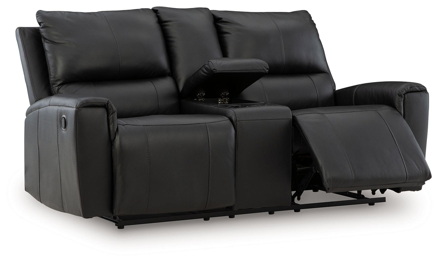 Looking for that perfect blend of comfort and style? This reclining loveseat with console wraps you in luxury with an expertly crafted combination of leather and faux leather upholstery. Its clean lines and rich neutral tone work beautifully in contemporary spaces. Plump pillow top arms and pull tab reclining motion make it your go-to spot for relaxing after a long day.