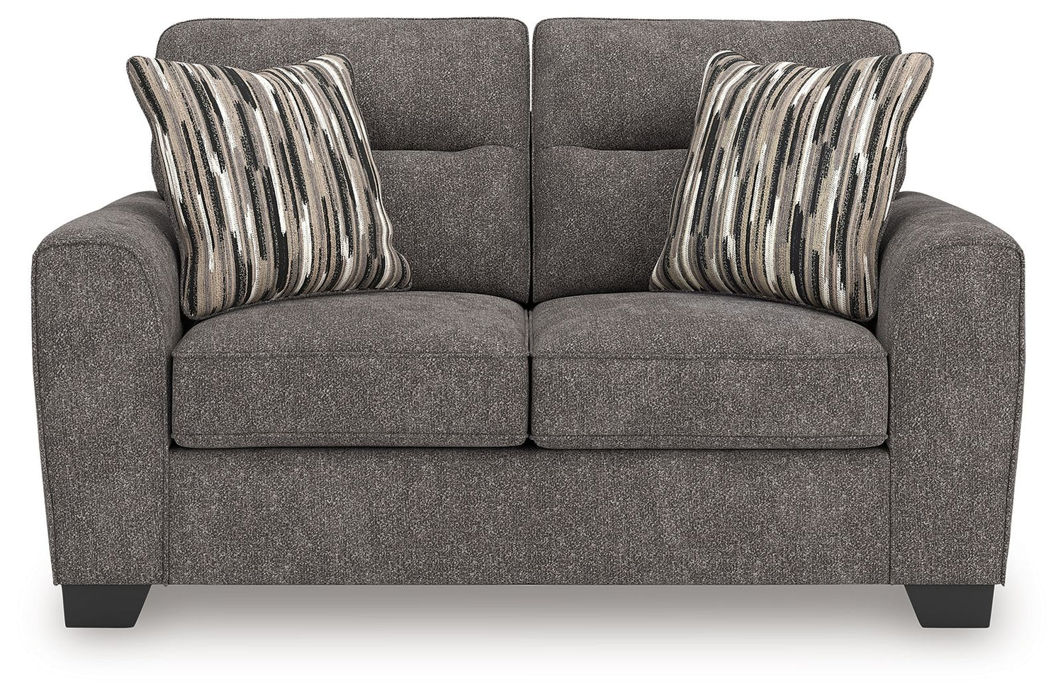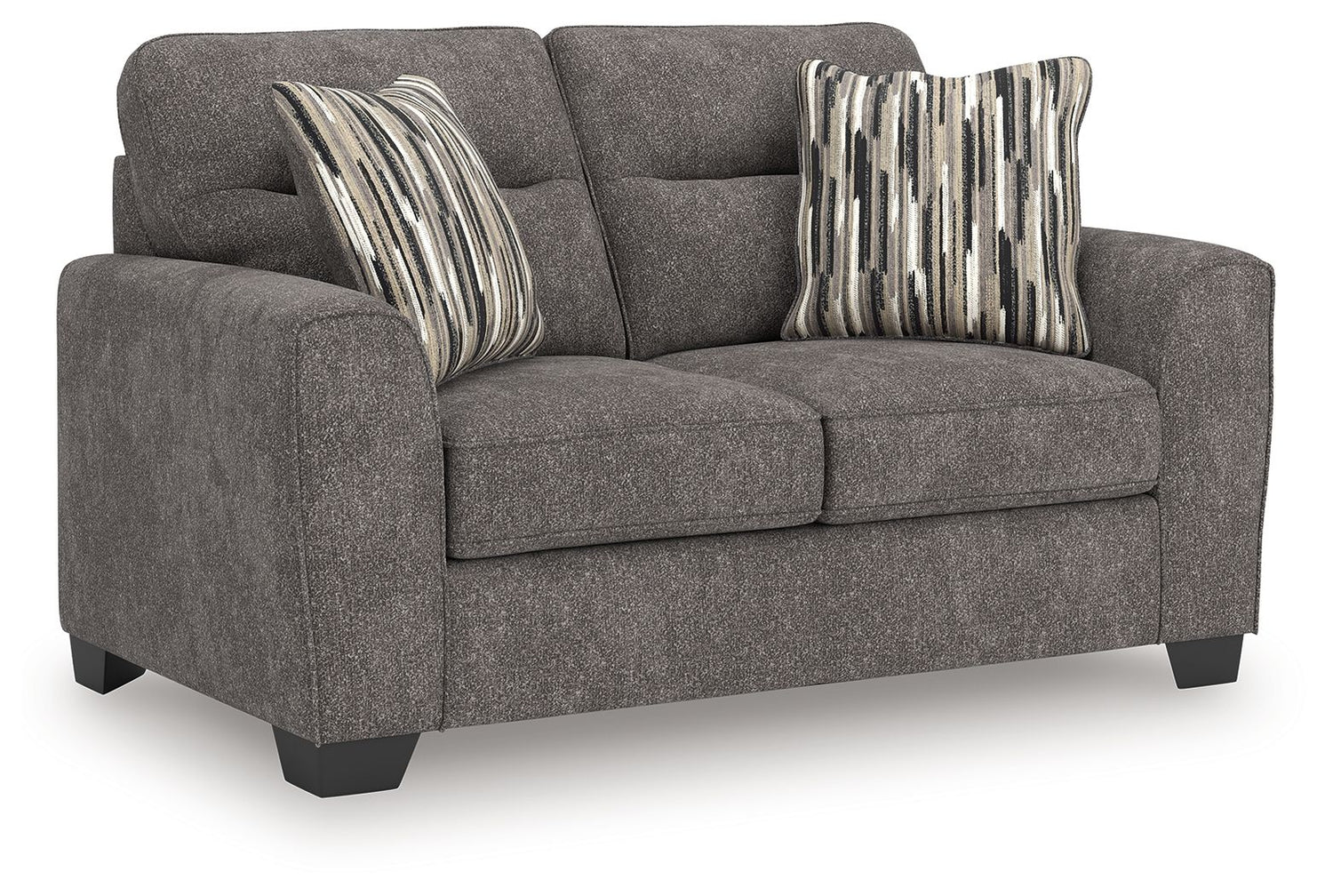 Strike a balance between the indulgent comfort you crave and the contemporary aesthetic you long for. The fabulously soft upholstery of this loveseat takes neutrals to new heights. Plus there's plenty of room to spread out and relax solo or with your bestie. Geometric-patterned accent pillows perfect the richly on-trend aesthetic.